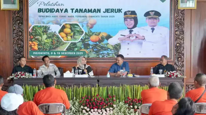 Pemerintah Kota Mojokerto memperkuat kapasitas petani jeruk melalui Pelatihan Budidaya Jeruk yang digelar di PLUT Maja Citra Kinarya, Sabtu (13/12). Kegiatan tersebut menjadi langkah strategis untuk meningkatkan produktivitas jeruk sekaligus menyiapkan wisata petik jeruk di kawasan Taman Bahari Mojopahit (TBM).